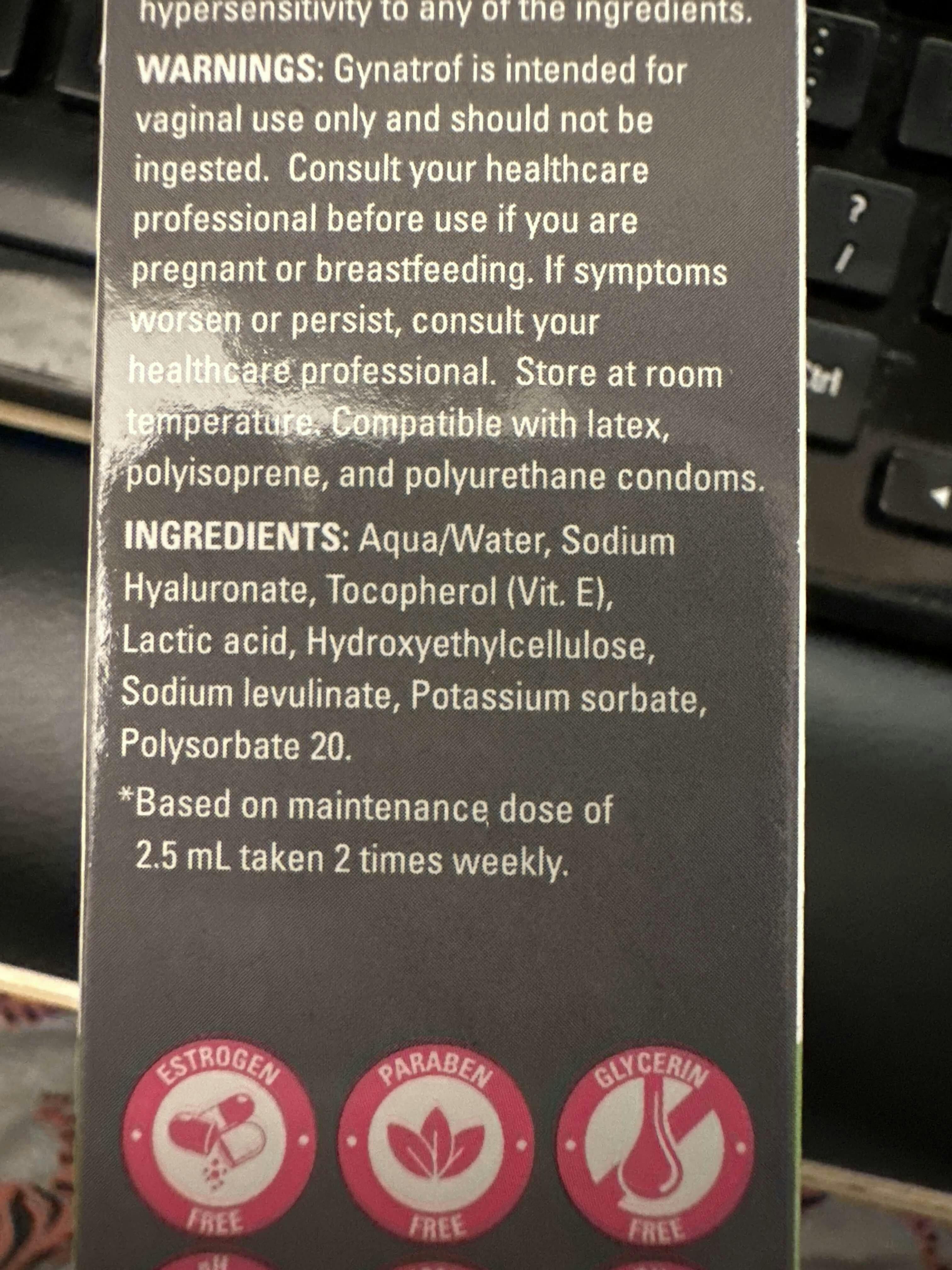 Gynatrof improves the natural hydration of the vagina and supports the regeneration of damaged vaginal tissues. It maintains tension and moisture in the perivaginal and vaginal areas and can be used to facilitate sexual activity.
